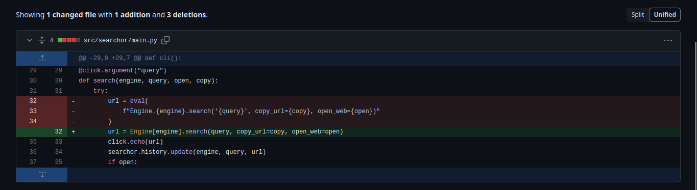 The github commit related to this shows where the vulnerability is within the code (https://github.com/ArjunSharda/Searchor/commit/29d5b1f28d29d6a282a5e860d456fab2df24a16b)